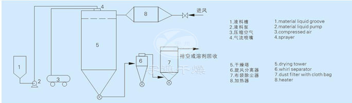 潔凈空氣加熱后進(jìn)入干燥塔,在塔內(nèi)熱風(fēng)中用二流體(或三流體)噴嘴將各種料液物化成微小液滴,與熱風(fēng)進(jìn)行快速熱交換,蒸發(fā)掉液料中的水份(或溶劑),并隨熱風(fēng)排出,得到粉狀產(chǎn)品。