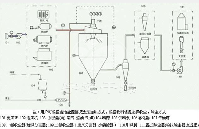 1、熱氣流與霧滴的接觸:有足夠量的熱氣流進入噴霧干燥室時,必須考慮熱氣流的方向及角度,無論是并流、逆流還是混流,確保與霧滴的充分接觸,才能進行充分的熱交換。