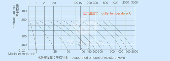 注:水份蒸發(fā)量與物料的特性及熱進風、出口溫度相關。當出口溫度為90oC,其水份蒸發(fā)曲線見上圖(供選型參考),隨著產品不斷更新,有關參數變更,恕不預先通知。