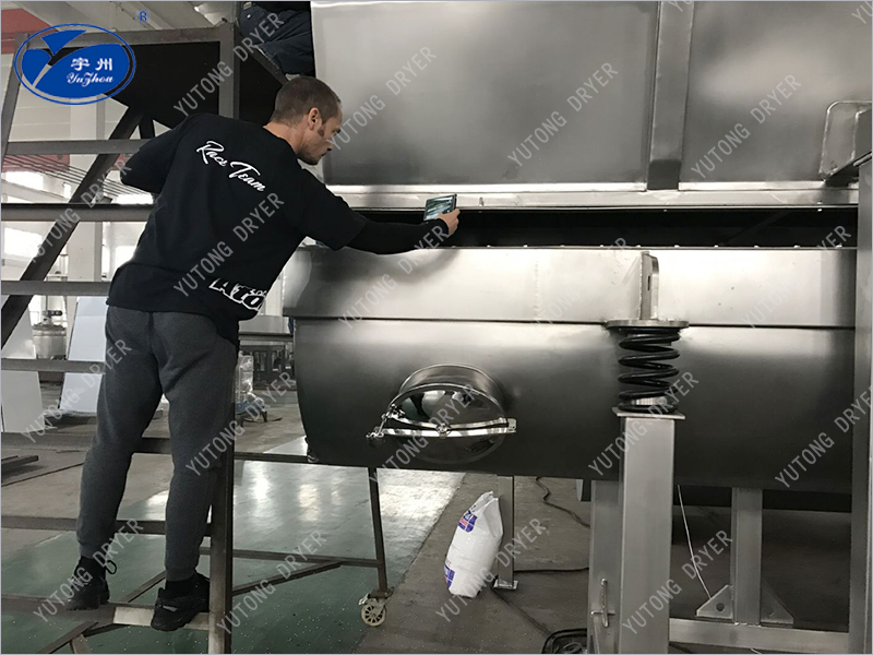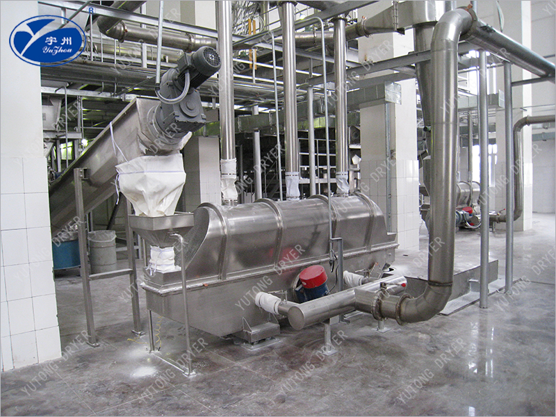 物料自進(jìn)料口進(jìn)入機(jī)內(nèi),在振動力作用下,物料沿水平面流化床拋擲,向前連續(xù)運(yùn)動,熱風(fēng)向上穿過流化床同濕物料換熱后,濕空氣經(jīng)旋風(fēng)分離器除塵后由排風(fēng)口排出.干燥物料由排料口排出。