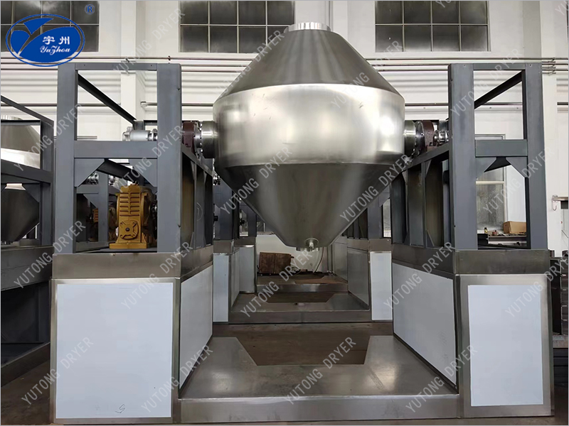 雙錐回轉(zhuǎn)真空干燥機(jī)為雙錐形回轉(zhuǎn)罐體,設(shè)備中間為圓柱形,兩端為圓錐形,圓錐頂部一頭設(shè)計為敞開式投料(兼做人孔),另一端為蝶閥出料。罐體內(nèi)、外共分三層,中間夾套加熱介質(zhì)可以是蒸汽、循環(huán)熱水或?qū)嵊?,保溫層為中堿超細(xì)玻璃棉,耗能極少;內(nèi)層投放物料。工作時罐內(nèi)處在真空狀態(tài)下,向夾套內(nèi)通入導(dǎo)熱油、熱水或蒸汽等熱媒進(jìn)行加熱,熱量通過罐體內(nèi)壁傳遞給濕物料。