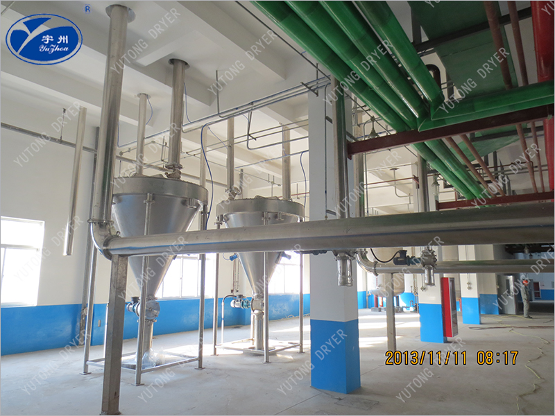 經(jīng)過(guò)初、中效過(guò)濾的環(huán)境空氣由干燥系統(tǒng)鼓風(fēng)機(jī)鼓入蒸汽散熱器加熱至工藝設(shè)定溫度,進(jìn)入閃蒸干燥主機(jī),與經(jīng)過(guò)螺旋加料器送入干燥主機(jī)的待干燥濾餅,在干燥主機(jī)唄完成傳熱介質(zhì)的干燥過(guò)程,氣固混合物由布袋除塵器分離、過(guò)濾后,物料被從干燥系統(tǒng)氣體內(nèi)分離出來(lái),排出干燥系統(tǒng),尾氣由引風(fēng)機(jī)排入大氣。