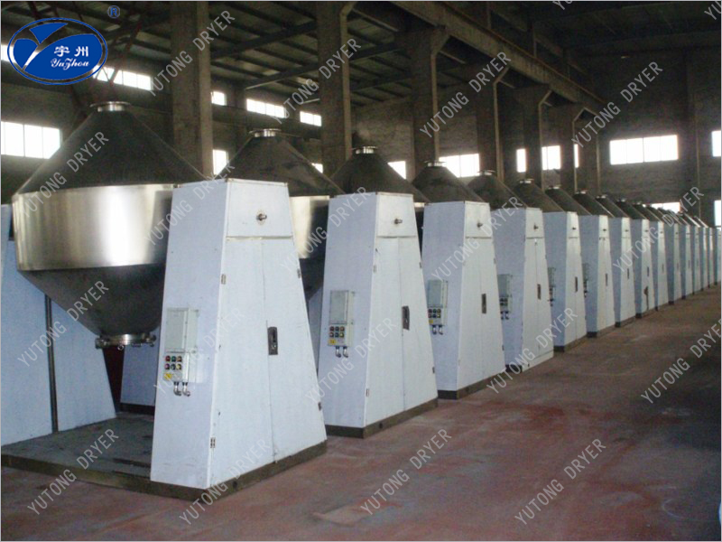 本機(jī)將粉末或粒狀物料通過(guò)真空輸送或人工加料到雙錐容器中,隨著筒體的不斷旋轉(zhuǎn),物料在容器中進(jìn)行復(fù)雜的撞擊運(yùn)動(dòng),達(dá)到均勻的混合。