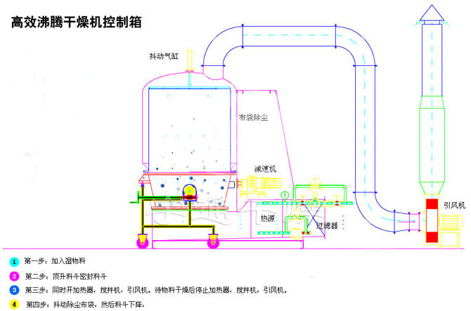 空氣在高壓離心通風(fēng)機(jī)的作用下,經(jīng)過(guò)空氣過(guò)濾器過(guò)濾,進(jìn)入空氣熱交換器加熱至設(shè)定溫度,然后通過(guò)氣體分布板形成無(wú)數(shù)高速氣流束沖擊物料,氣束間所形成的負(fù)壓作用物料,使之成為沸騰狀。此狀態(tài)下熱空氣與物料廣泛地接觸,增強(qiáng)了傳熱過(guò)程,因而在較短的時(shí)間內(nèi)促使物料中的水份蒸發(fā)、分離。濕氣流透過(guò)捕集袋由風(fēng)機(jī)排出,被捕集袋截留在沸騰器內(nèi)的物料則為干燥產(chǎn)品。
