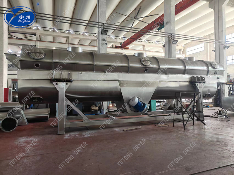 物料自進(jìn)料口進(jìn)入機(jī)內(nèi),在振動力作用下,物料沿水平面流化床拋擲,向前連續(xù)運(yùn)動,熱風(fēng)向上穿過流化床同濕物料換熱后,濕空氣經(jīng)旋風(fēng)分離器除塵后由排風(fēng)口排出.干燥物料由排料口排出。